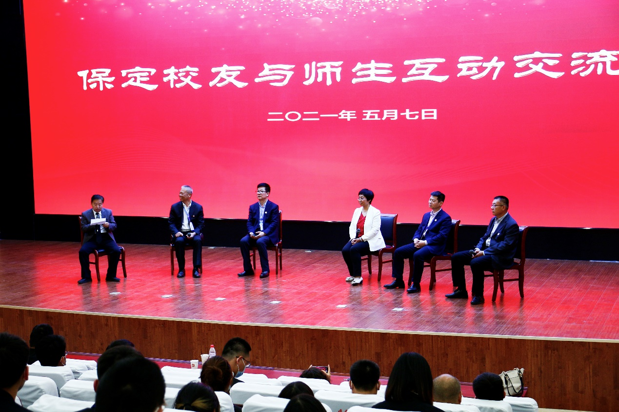 讲座结束后,随即在新能源交流中心举办了保定校友与师生互动交流会。高秋利、刘永建、黄一成、柳淑巧、王立祥五位校友与到场同学们分享宝贵经验,为同学们答疑解惑,勉励同学们刻苦学习,勤奋钻研,敢于创新,勇攀学术高峰。