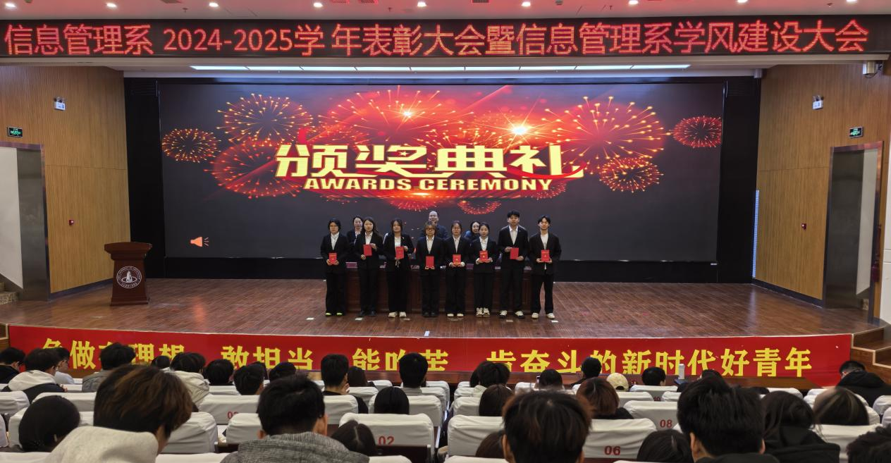 肖丹宣读了《信息管理系关于2024-2025学年获奖学生的表彰决定》,与会领导为获奖学生颁发证书和奖品。“国家奖学金”荣获者邱传兴同学发言,他分享了自己的学习体会,倡议全系学子以更高的标准要求自己,为国家的繁荣富强贡献青春和力量。
