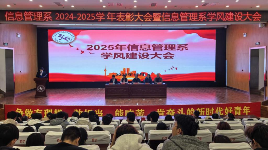 12月9日下午,信息管理系举行2024-2025学年表彰大会暨学风建设大会。系党总支书记、主任王赫,副主任肖丹,教研室主任康丽峰、王海东出席会议,大会由学工办主任史海嫣主持,信息管理系全体师生300余人参加。