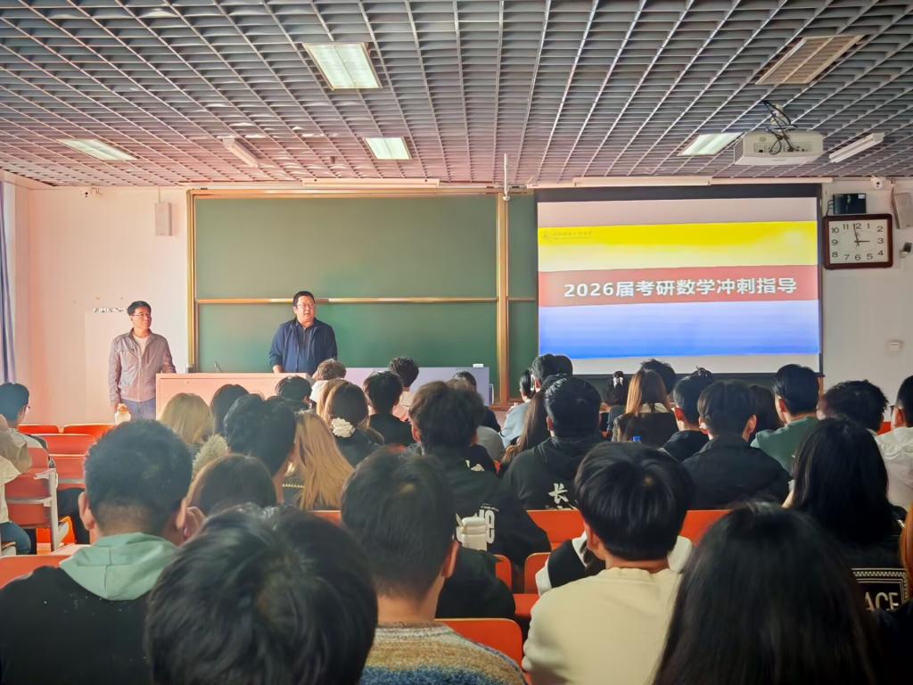 学院加强顶层设计,统筹整合教学、学工、导师三方力量。今年6月10日,学院党委会专题研究就业工作,将考研助力纳入年度任务,成立专项工作组,为学生制定个性化备考方案;发挥学业导师作用,提供针对性报考指导。10月14日至12月11日,学院邀请数理系经验丰富的教师举办5场考研辅导,深入解析命题趋势,帮助学生强化知识体系;注重朋辈引领,激发学生内动力。6月至10月,邀请杨文举(东北大学博士)、褚智博(中国科学技术大学硕士)等优秀毕业生举办4场经验分享会,内容涵盖院校选择、备考策略与复试技巧,覆盖学生300余人,形成可操作、可借鉴的考研指南;坚持暖心服务,优化备考保障。学工团队建立“每周一访”机制,跟踪学生心理状态,及时进行情绪疏导。10月起专设考研自习室并制定管理办法,营造良好复习环境。冲刺阶段,学院领导班子还为学子发放“助研加油包”,内含文具、食品及定制手提袋,传递人文关怀。