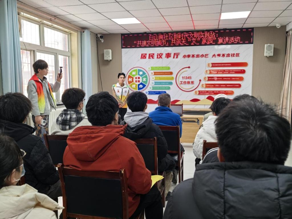 环境整治的同时,文明宣传同步发力。师生志愿者们化身“文明宣传员”,向社区居民发放文明养犬、禁止飞线充电等宣传资料300余份,结合生活实例细致讲解相关文明规范和安全隐患,引导居民自觉践行文明行为,让文明理念深入人心。此外,“冀建青春”防艾服务队志愿者还开展了“共建文明城市,共筑无‘艾’家园”主题宣讲活动,用通俗易懂的语言普及艾滋病传播途径、预防方法等核心知识,传递健康生活理念,助力营造健康和谐的社区氛围。