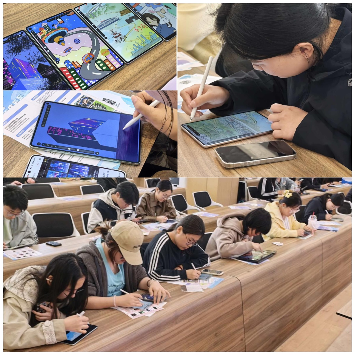 比赛现场,参赛学生们全神贯注、凝神创作,手持华为平板与手写笔,在天生会画App上挥洒灵感、勾勒创意。从线条的精准勾勒到色彩的巧妙填充,从细节的反复打磨到整体构图的精心布局,每一位选手专注的神情里,都饱含着对绘画的热爱与对主题的深刻理解。选手们围绕“未来之城·青年想象、乡村振兴·家乡筑韵、青春誓言·筑梦蓝图”三大主题,各展所长、大胆创作,呈现出一幅幅兼具思想性与艺术性的数字作品。赛场氛围热烈而有序,选手们在创作中交流想法、切磋技艺,在碰撞中迸发灵感,充分彰显了数字绘画的独特魅力与青年学子的蓬勃活力。比赛结束后,评委根据作品综合表现评选出各奖项,获奖学生上台领奖并合影留念。